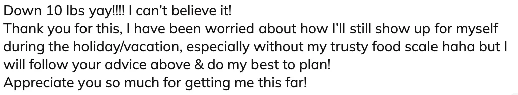 Vacations are a part of life and where a lot of women get stuck on the on or off cycle. My goal for you in this program is to learn how to enjoy vacations, trips, and being off track without stressing about losing progress. Your plan is flexible so you can take it with you or take the time off. it's entirely up to you - I just give you what you need to support you!